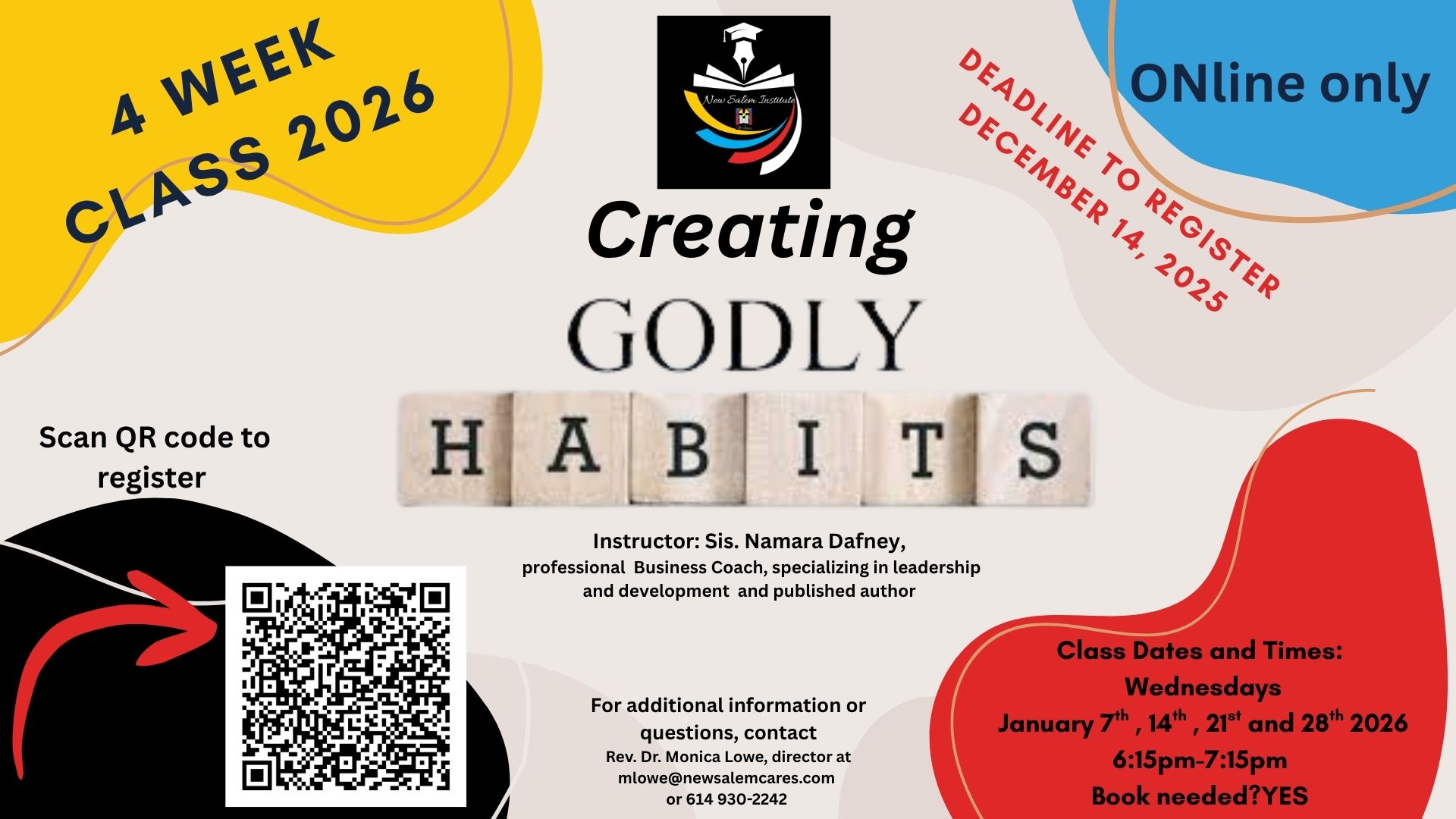 New Salem Institute is registering for 2026 Courses. Transform your life by “Creating Godly Habits” —sign up today and start building godly habits that last! Habits help save time and energy, giving us greater capacity to focus on what really matters, and they help us become the best version of ourselves. By understanding the importance of godly habits, we become more Christ-like, setting the stage for a deeper connection to God. This 4 week online class is on Wednesdays and starts January 7th. Deadline to Register is Dec. 14th