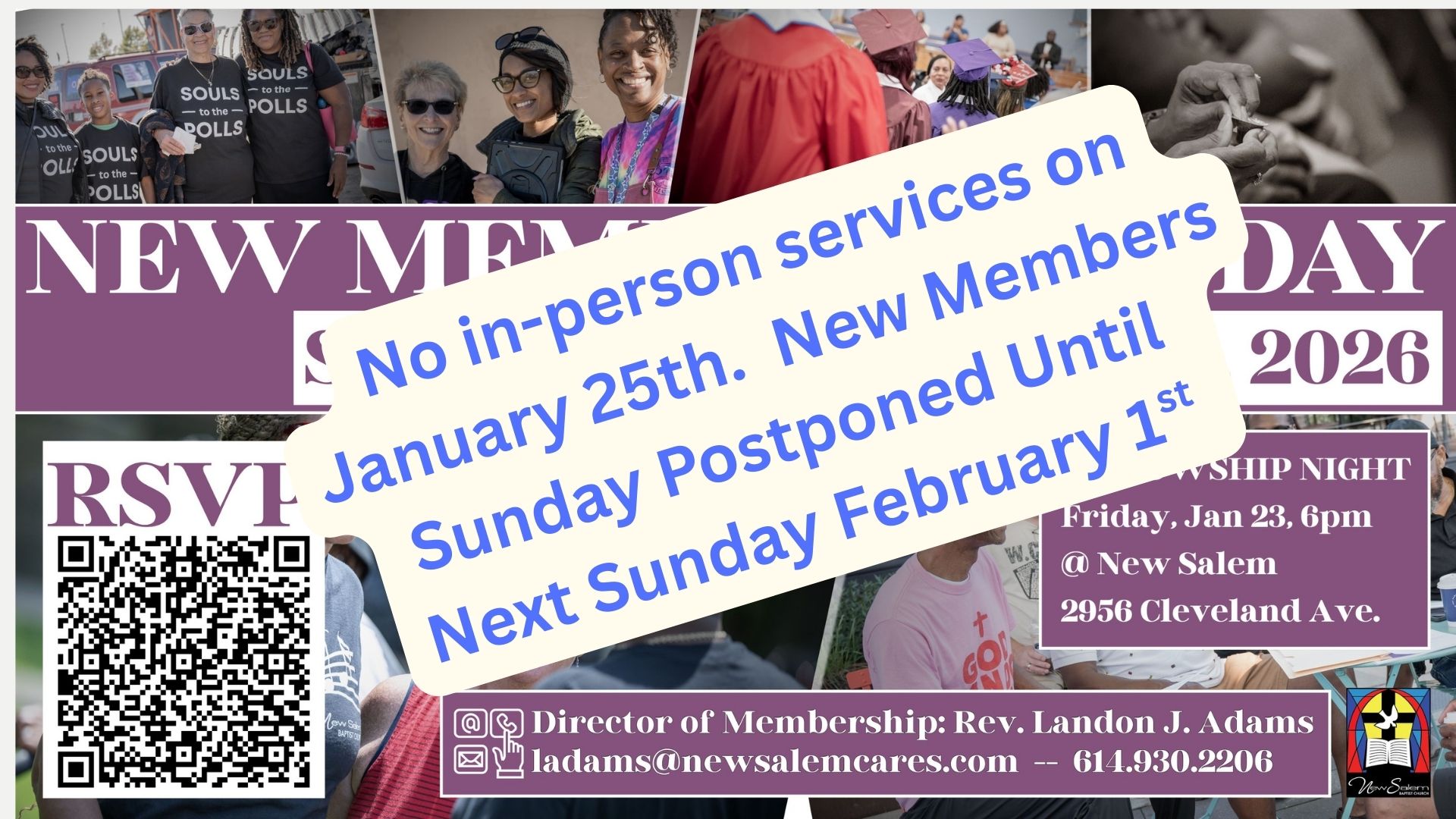 Due to the weather forecast, New Salem will not be having in-person church services on Sunday, January 25, 2026.  NSI classes will still occur.  Our New Member’s celebration will be postponed until  February 1, 2026.  We will rebroadcast one of our previous services during at 10:00 am.  Please stay safe and look forward to seeing you again next week.